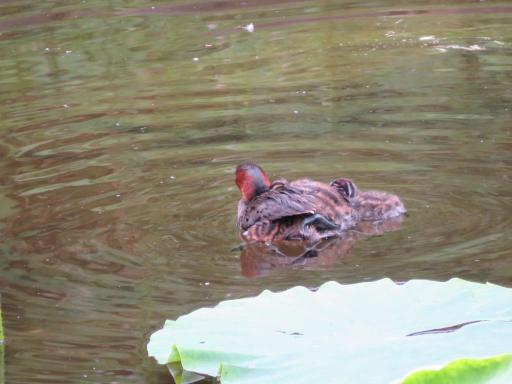 - 公園の池などでも見られる小さなカイツブリ類。潜水して食べ物を獲るのが得意で、魚や水生昆虫の他にザリガニや植物の実なども食べる。一夫一妻で、オスとメスが協力して巣作りや抱卵、育雛を行う。少し泳げるようになった頃のヒナは、泳いでいる親の背中に乗って頭だけ出している時もある。時には3羽も乗ることがある。(くま)