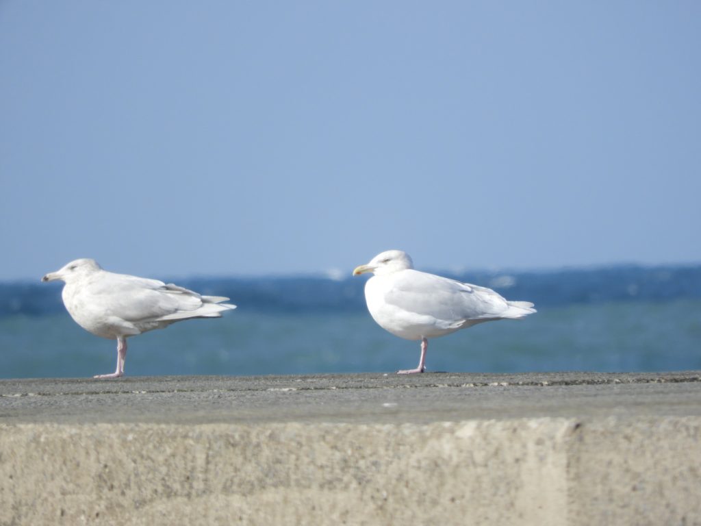 - 体上面の色は淡い青灰色で、翼の先は白色。特に第1回冬羽は体上面もかなり淡く、全体的に真っ白に見える。足はピンク色。日本で見られるカモメ類の中では最大級。他の大型カモメ類の群れの中に1〜数羽見られることが多い。冬鳥として全国にやってくるが西日本では少ない。(くま)