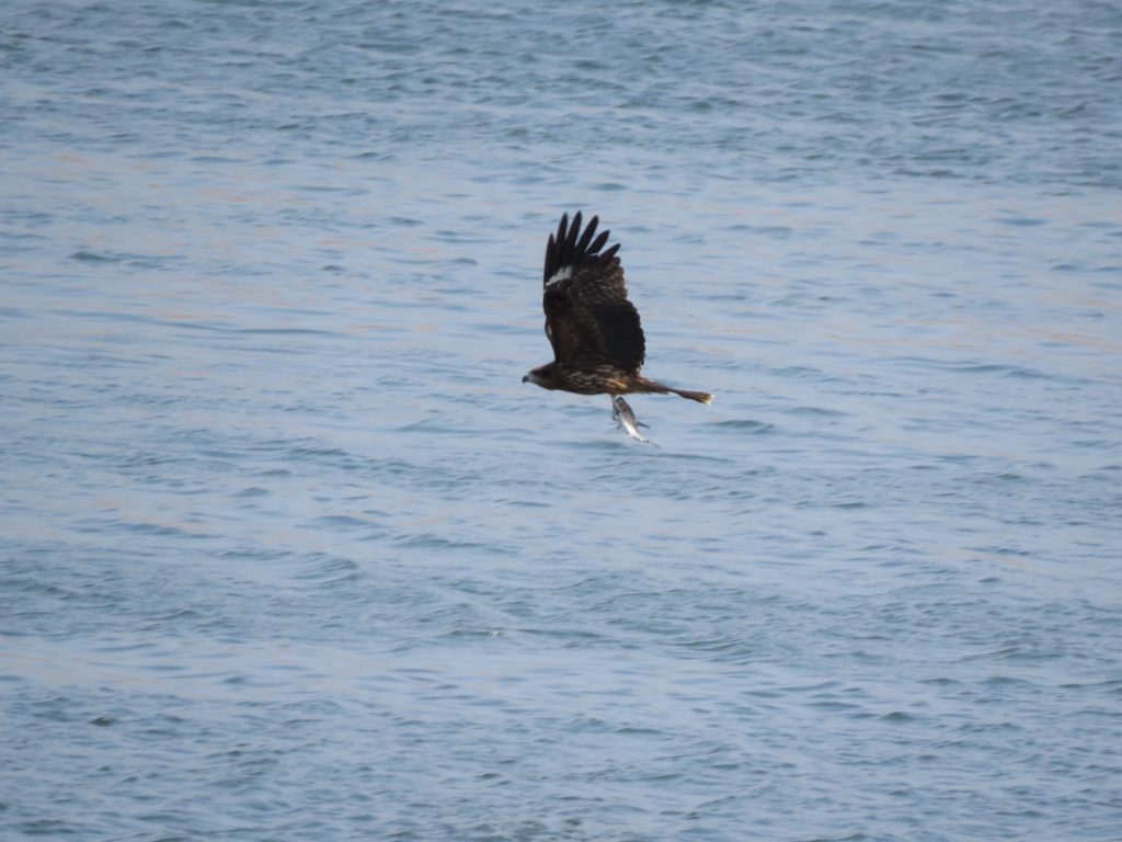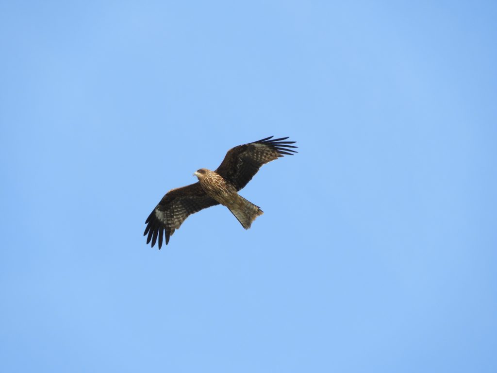 - ピーヒョロロロという鳴き声は誰もが一度は聞いたことがあるだろう。最も馴染み深いタカである。山地から海岸まで様々な環境で見られるが、特に海辺で多い。屍肉や生ごみを食べることが多く、あまり生きているものの狩りはしない。あまり羽ばたかずに、翼を広げて輪を描くように上昇気流にのる姿は趣深い。翼の先の白斑と尾羽中央が凹んでいるのが特徴。(くま)