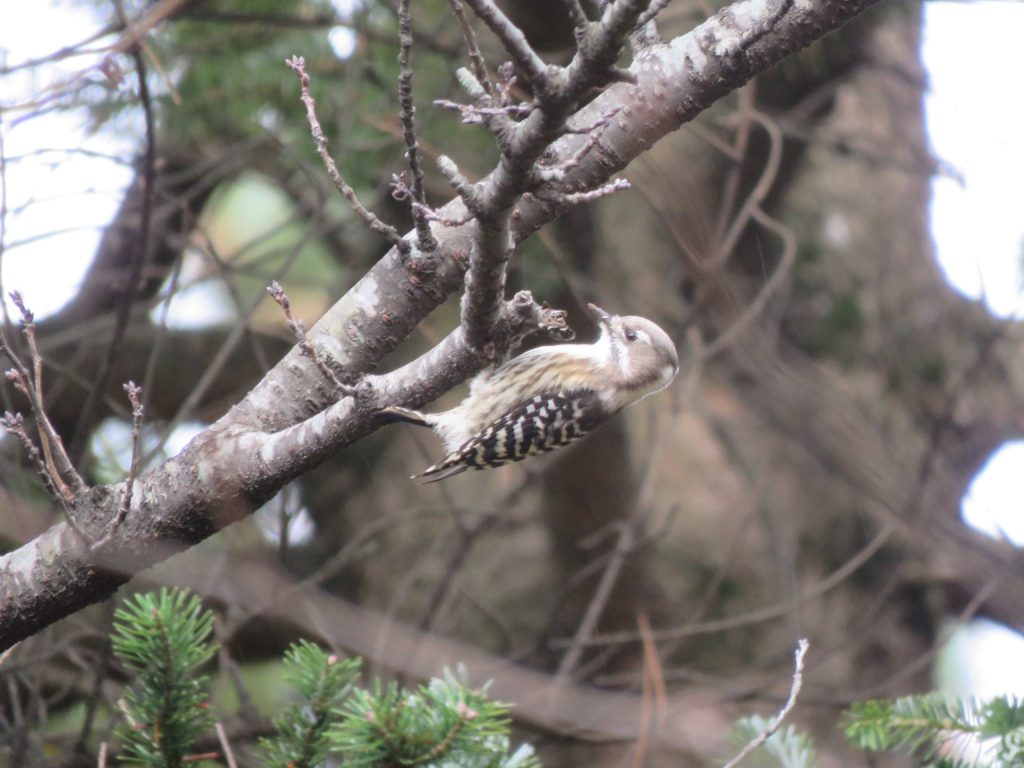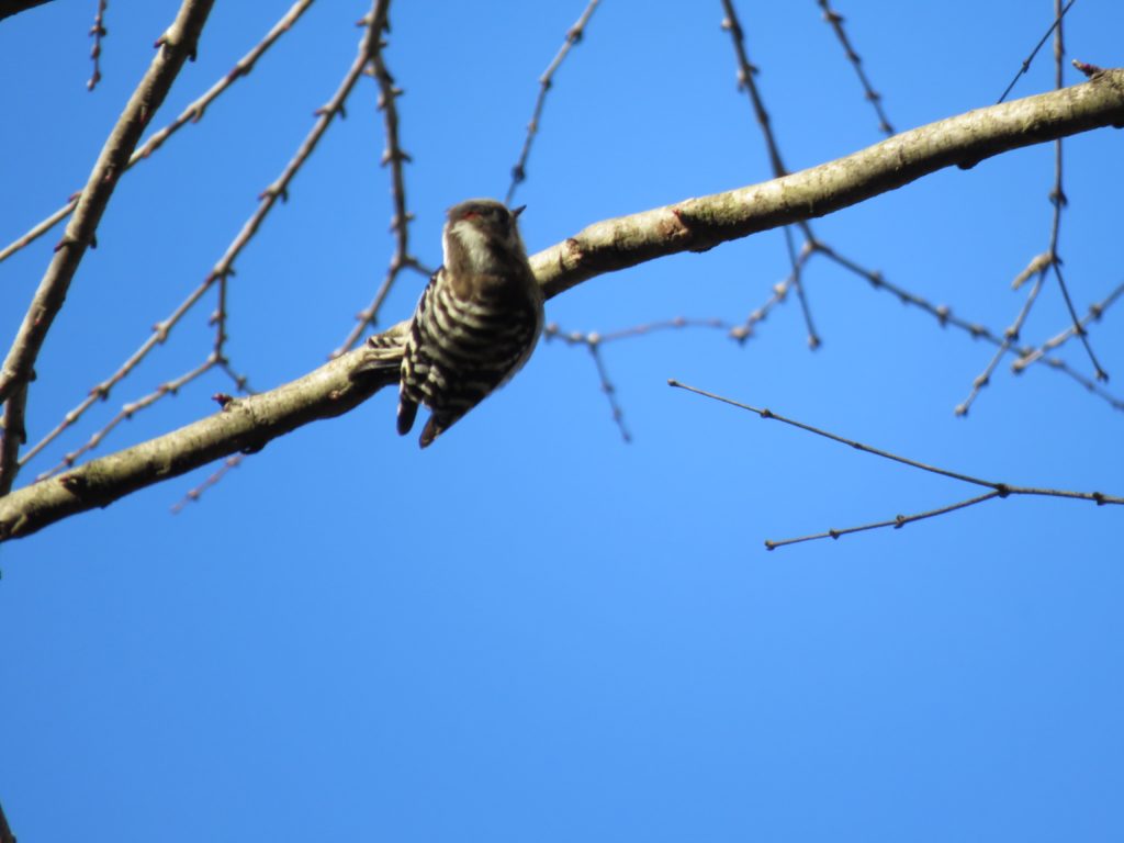 - 日本最小のキツツキで、大きさはスズメ程度。他のキツツキ類に比べて割と市街地でも見られ、時にはカラ類の群れの中にそっと混じっていることもある。キツツキ類の仲間は木に止まる時に体を支えられるよう尾羽がしっかりしていて足指が前後に2-2で向き爪が鋭い。ギィーとドアの軋むような音で鳴く。(くま)