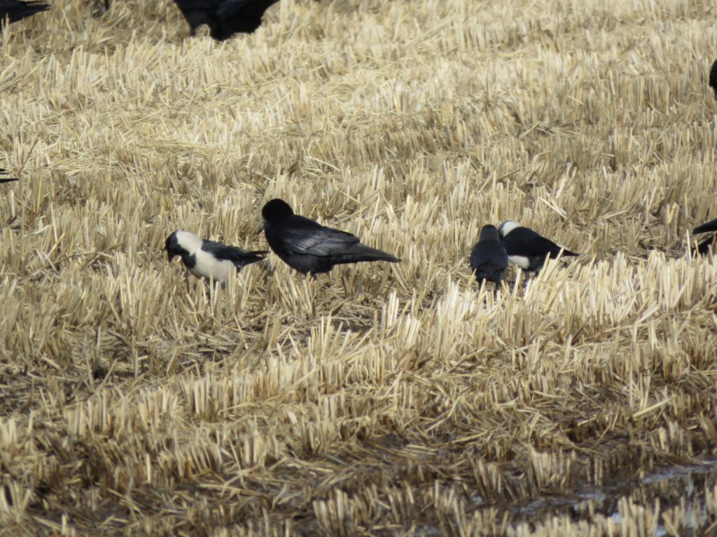 - 体が小さめな白黒のカラス。かつては主に九州地方を中心とした西日本に渡ってきていた冬鳥だったが、最近は北日本でも見られるようになった。単独よりは群れで見られ、同じく群れで行動する冬鳥であるミヤマガラスの群れの中に数羽混じっていることが多い。ミューと鳴く。全身黒いのもいる。(くま)