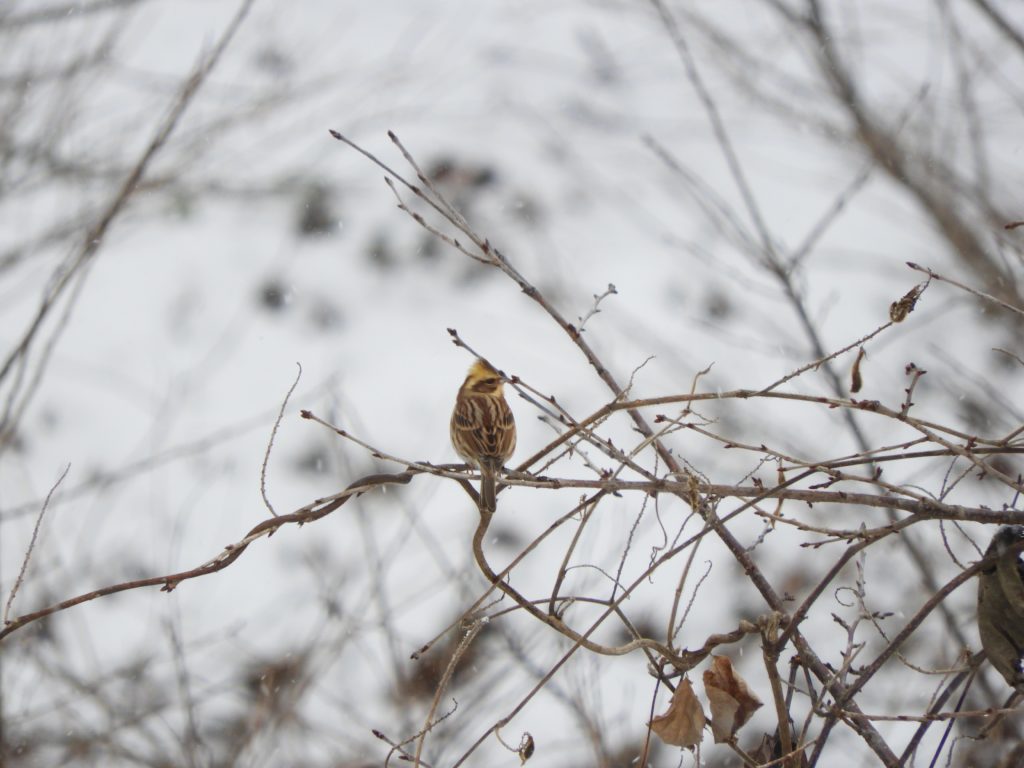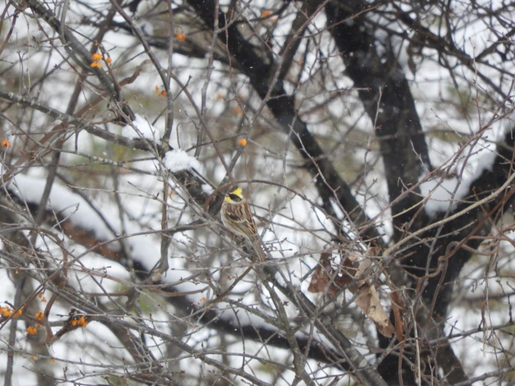 冠羽が目立つトンガリ頭の冬鳥。オスは顔の黄・黒・白の三色のコントラストがとても印象的。低地に降りてホオジロの中に混じっていることもあるが、山地の開けた明るい林などで見かけることの方が多い。(くま)