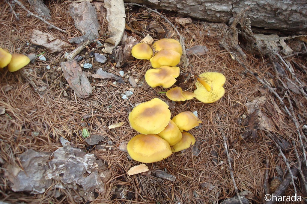 - かさは径2~4.5cm、表面鮮黄色で中央は帯褐色、ひだはレモン色~菜の花色、密。柄は長さ4~10cm、かさとほぼ同色、中空。工藤ら(1998)が青森県から日本新産種として報告した。写真はカラマツ林内に発生したもの。