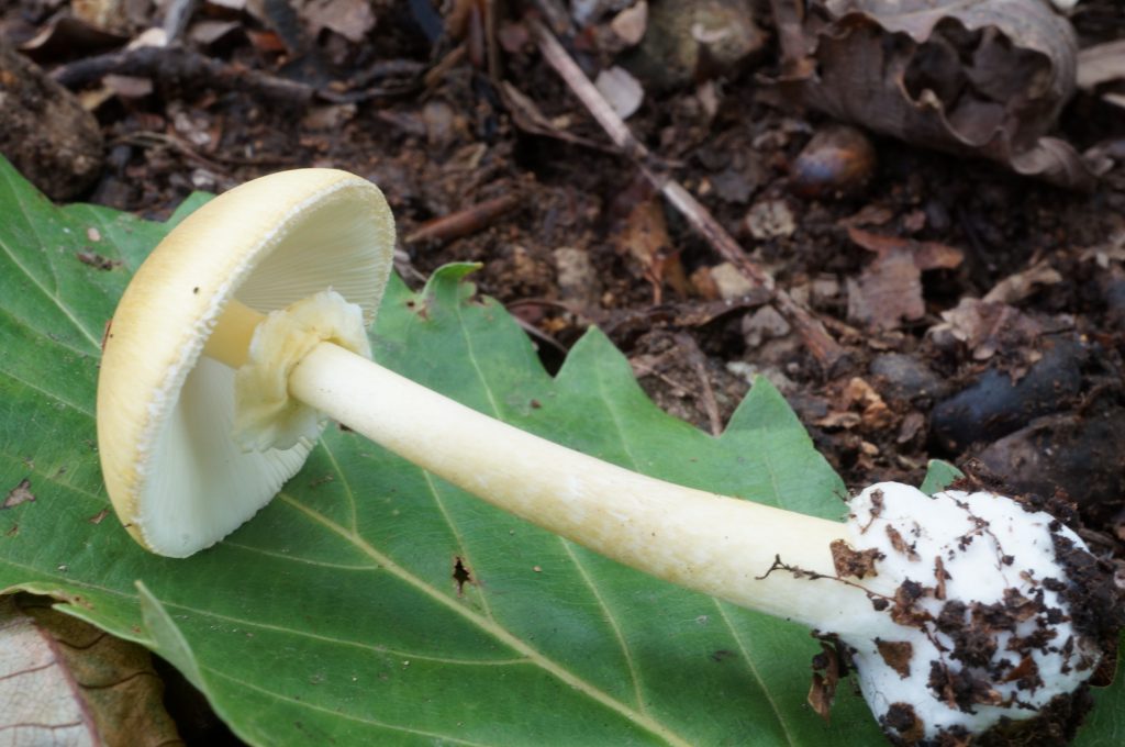 - かさは径3~7㎝、はじめ円すい状まんじゅう形、のち開いて平になる、表面は汚橙黄色~黄土色。ひだは白色、やや密。柄は長さ6~11㎝、淡黄色~白色、中実、上部に白色膜質のつば、下部に袋状のつぼをもつ