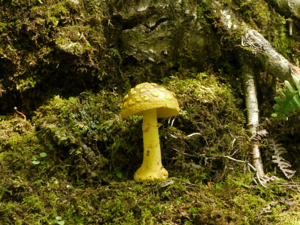 - かさは径4〜7㎝、はじめ卵形のち扁平に開く。表面に黄色粉質の鱗片が貼りつき、帯褐黄色〜黄褐色。ひだは密、白色〜淡黄色。柄は長さ7〜11㎝、膜質のつばを有し膨んだ基部に鮮黄色のツボが附着する。