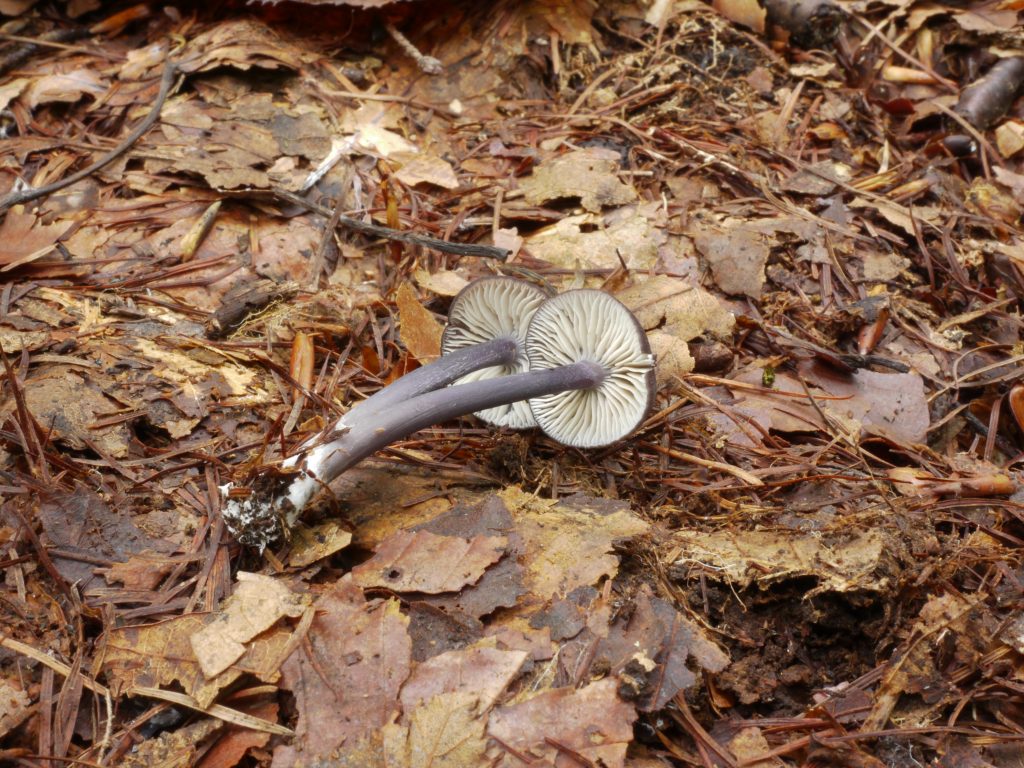 - かさは径1〜3㎝、はじめまんじゅう形のち中央がヘソ状態にくぼんだ扁平に開く。表面は粘性なく微細鱗片か微毛で覆われ、周辺部に条線があり、はじめ黒色のち深紫色にかわる。ひだはやや疎、はじめ白色〜淡灰色のち淡紅褐色にかわる。柄は長さ2〜5㎝、基部は白色の菌糸で覆われ、深紫色。