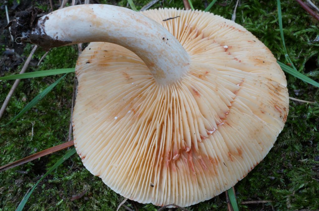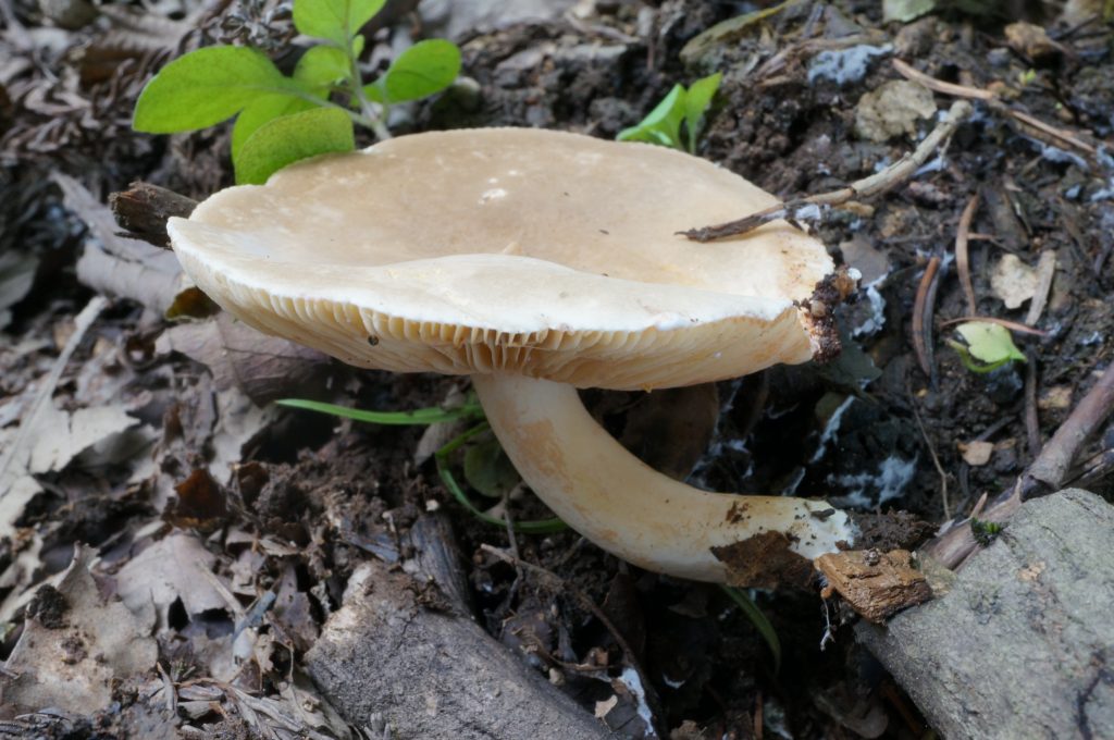 - かさの径3~7㎝、中央が少しくぼむかまたはややじょうご形、表面は粉状で粘性があり、灰黄褐色~暗黄褐色、中央部に小じわがある。ひだは淡色のち黄肉色、やや密。柄は長さ2.5~6㎝、中空、かさと同色~淡色。肉は白色、傷つくとすみやかに紅変する(写真下)。乳液は白色、空気に触れると淡紅色に変わり、強い辛味がある。