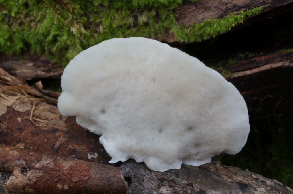 - かさは半円形で丸山形、幅1~6㎝。表面は白色~淡褐色でしばしば青みを帯び、細毛~粗毛におおわれる。肉は白く柔軟な肉質。管孔は微細、はじめ白色だがしだいに青味を帯びる(写真下)。