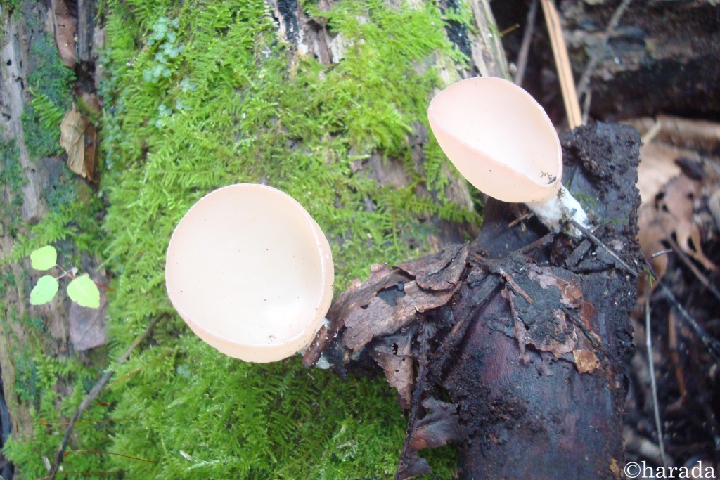 - 子実体は子のう盤で柄をもつ。子のう盤は強じんな肉質、碗状~さじ状、径3~6cm、淡いピンク色~淡黄白色。柄は中心生あるいは偏心生、長さ1~2cm。子のう盤の内表面に子実層があって、子のう胞子を蔵した子のうが並ぶ。気流や温湿度の変化に反応して胞子を飛ばす。