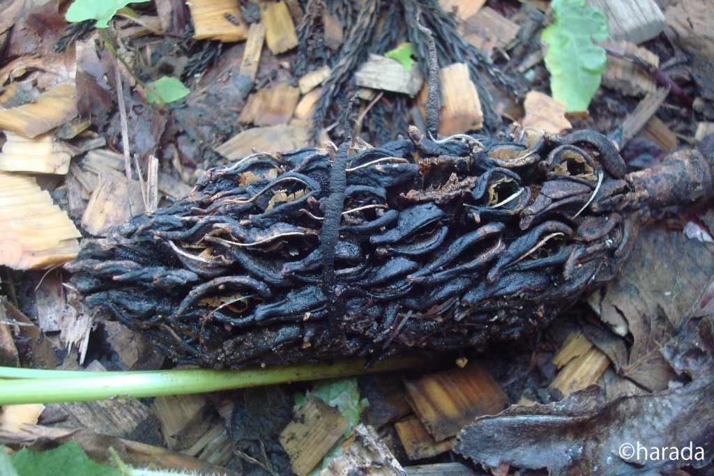- 子実体(矢印)はひも状~針金状で高さ2~5cm、太さ1~2mm, はじめ先端が灰色(分生子形成)、基部は黒褐色、熟すと中央部から上が太さを増し子のう子座となる。子座の表面は埋没する子のう殻のため表面が小粒状となる。