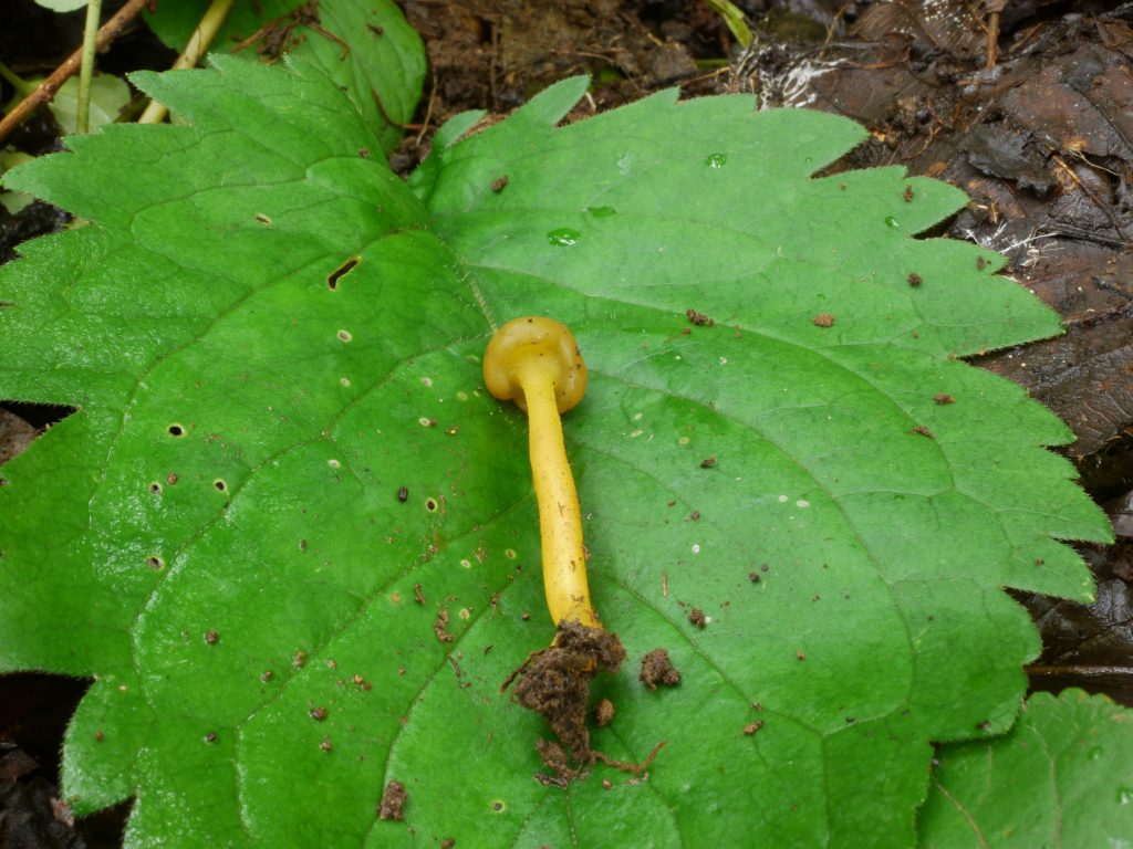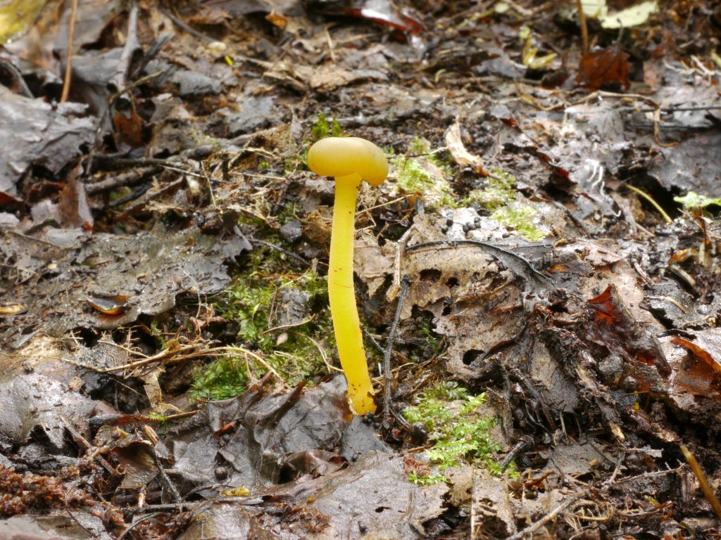 - 子実体は長さ3〜7 cm、径0.5〜1 cmで扁平球〜塊状の頭部(子のう盤)と長さ2〜6 cmの円柱形の柄からなる。頭部は湿時粘性があり、黄土色〜黄緑色、表層部に子実層がある。柄は頭部よりも淡色。