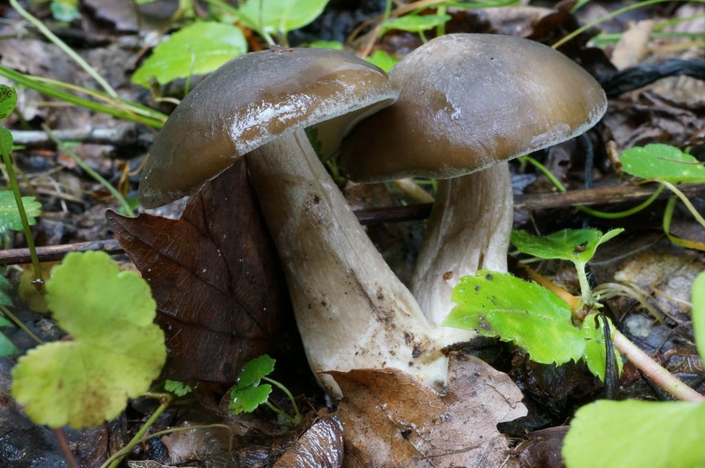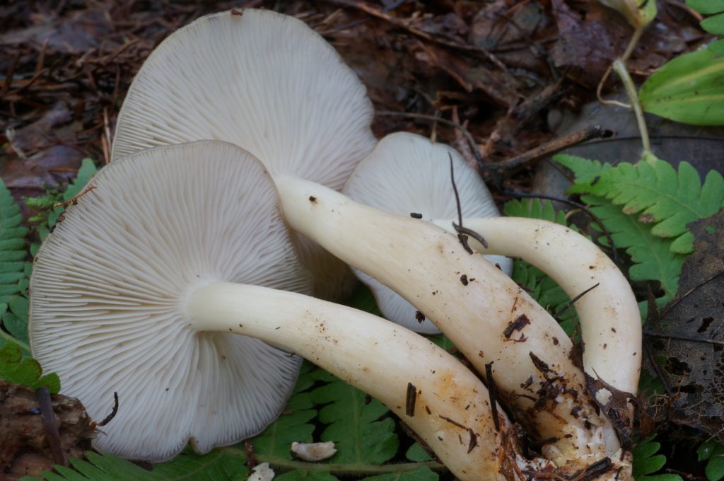 - かさは径3~12 cm、はじめまんじゅう形から平に開く、表面は淡灰黒色~灰白色。ひだは白色、密。柄は長さ5~8 cm、わずかに帯褐灰色で上部は粉状、上下同大または下方が顕著に太まる。