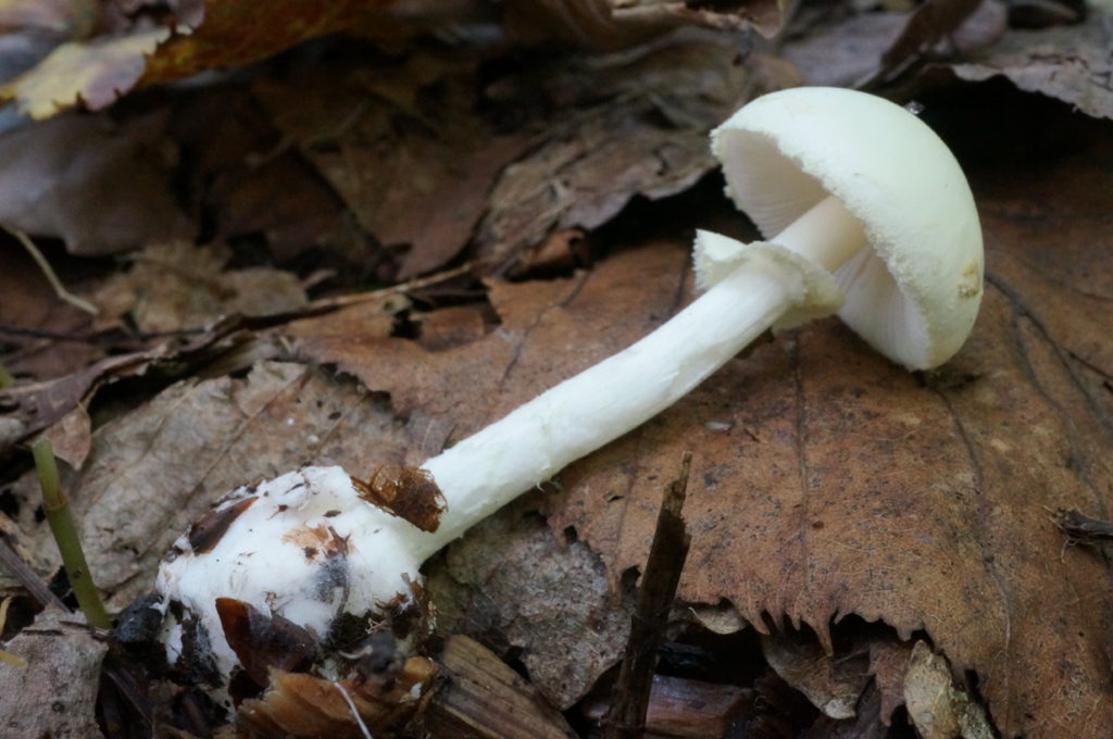 - かさは径5~15 cm、まんじゅう型から平らに開く、表面は淡黄色~汚黄色で絹布状のつやがある。ひだははじめ白色のち帯紅色を経て紫褐色となり、密。柄は長さ9〜15 cm、基部は白く球状に膨らむ。つばは膜質で薄く壊れやすい。