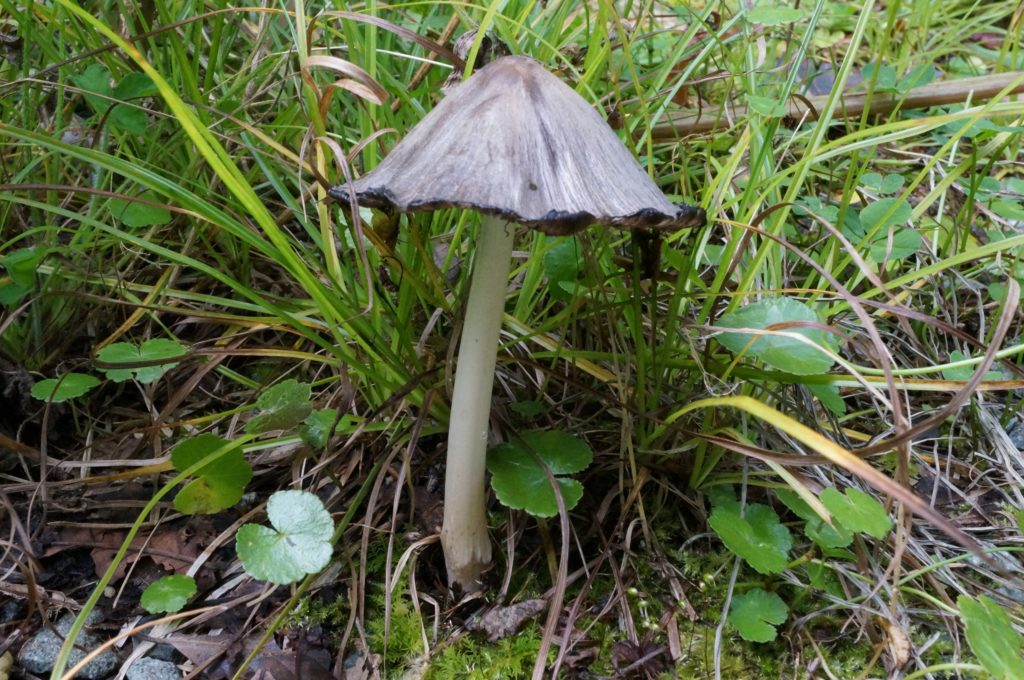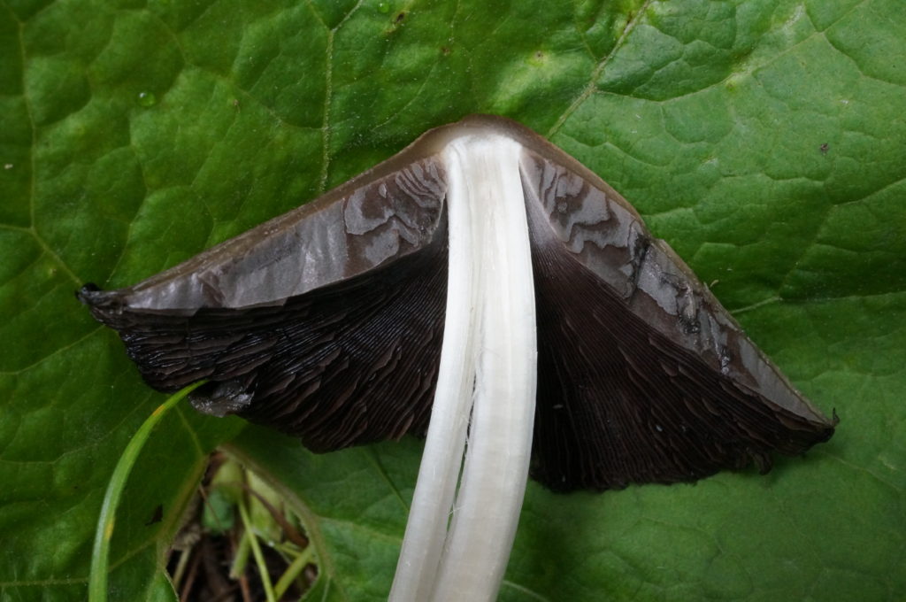 - かさは径5~8 cm、卵形から鐘状のち円錐形。表面は灰色~灰褐色、中央に鱗片、周辺部に条溝がある。ひだは白色のち黒色(写真下)、密。柄は長さ8~15 cm、白色、絹のような光沢がある、中空。