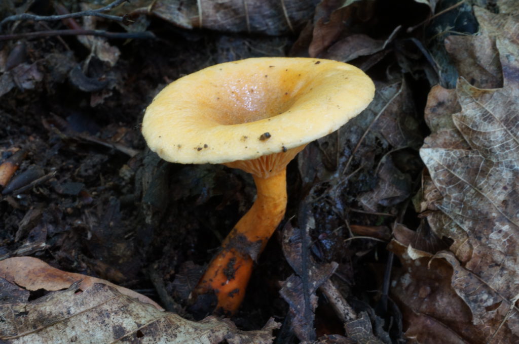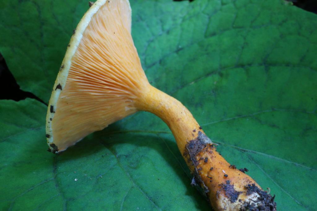 - かさは径2~9 cm、まんじゅう形からロート形になる、表面橙黄色、縁は内側に巻く。ひだは垂生、叉状分岐し、朱橙色、密。柄は長さ3~8 cm、下方やや太まり、中実。