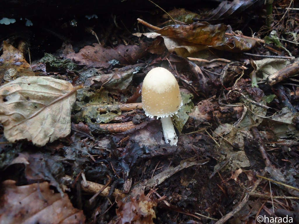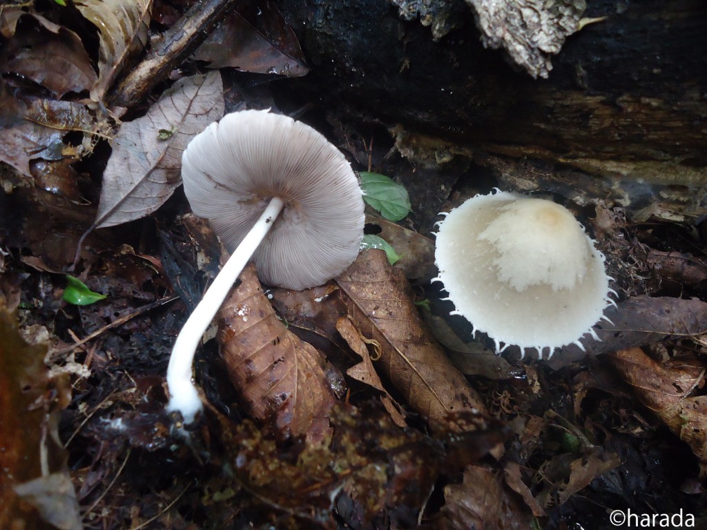 - かさは径3~7cm、表面は平滑で、淡灰褐色あるいは灰白色、周縁部には被膜の破片が着く。ひだは密、白色のち淡紅紫色から帯紫褐色に変わる。柄は長さ4~8cm、白色、中空。