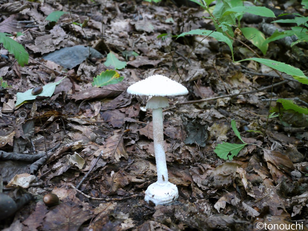 - 菌根菌。かさは径3~7cm、半球形から平らに開く、表面は白色、角錐状の小さないぼを付ける。ひだは白色、密。柄は長さ8~15cm、上部に膜状のつばをもち、基部はかぶら状に膨らむ。
