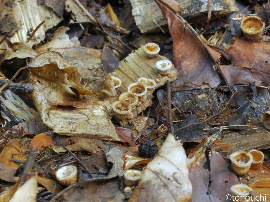 - 子実体はコップ形、下方に向かって細まり、径4~8㎜、高さ3~8㎜、外面は黄土色、はじめ密毛をかぶるがやがて褐色、平滑になる。中に碁石状、径1.5~5㎜の小塊粒があり、ここに担子胞子が形成される。