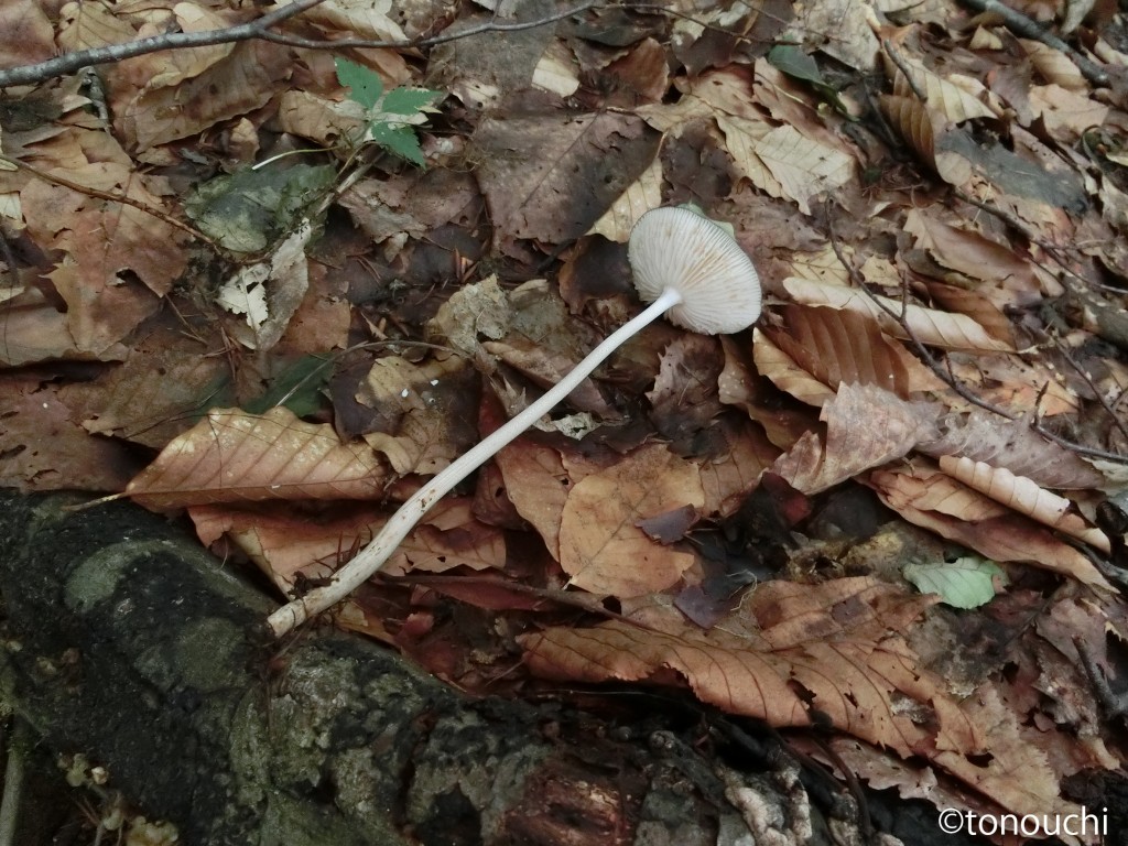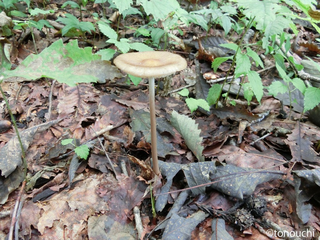 - かさは低い丸山形から、開いて中高の浅い皿状、径4~9cm、表面は淡灰褐色~暗褐色。ひだは白色、幅広く疎。柄は細長く10~16cm長、基部は肥大して根状となり地中に深く入り込む、中空。