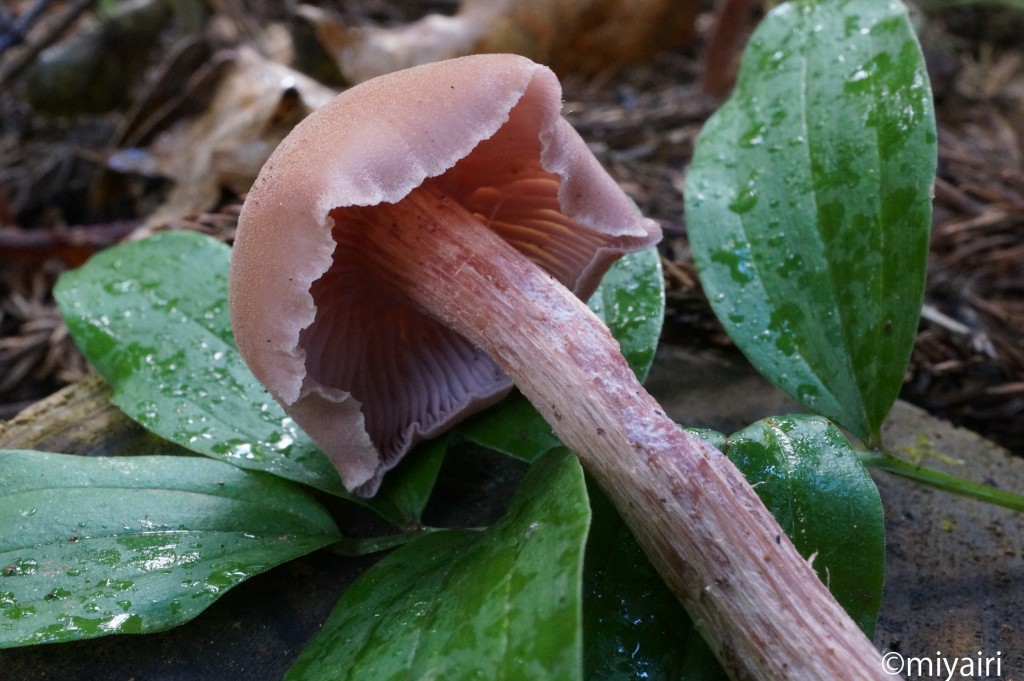 - アンモニア菌。かさは径3~6 cm、まんじゅう形から平らに開き、中央がややくぼむ、表面は細かいささくれがあり、黄褐色を帯びた肉色。ひだは帯紫肉色、やや疎。柄は長さ8~11 cm、中実。かさと同色で縦の繊維紋があり、基部は淡紫色の菌糸におおわれる。