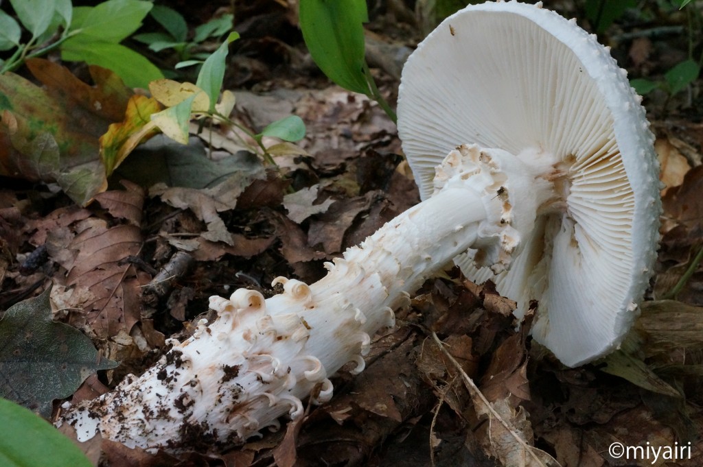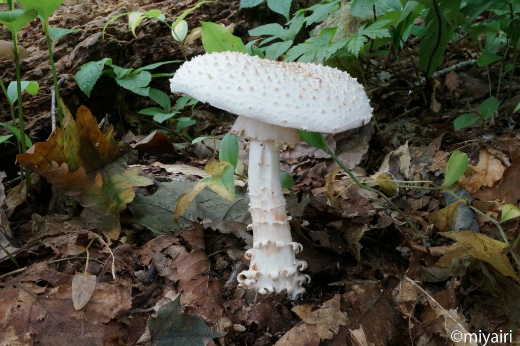 - 全体がほぼ白色であるが、成熟するにつれかさの中央部が淡赤褐色をおびる。かさは径4~8 cm、はじめ半円球でのちにほぼ平らに開き、表面にとがったいぼを散在する。ひだは白色~淡黄色、やや密。柄は長さ11~15 cm、下半部にはうろこ状のささくれを多数輪状につけ、基部は紡錘形にふくらみ中実。つばは頂生し永存性の厚い膜質。