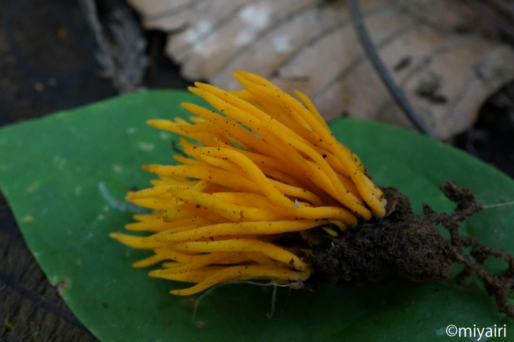 - 子実体は高さ5〜10 cm、紡錘形で表面が溝状にくぼみ尖頭、上部表面に子実層をつくる、鮮黄色〜帯褐黄色。ふつう数本〜10数本束状に叢生する。