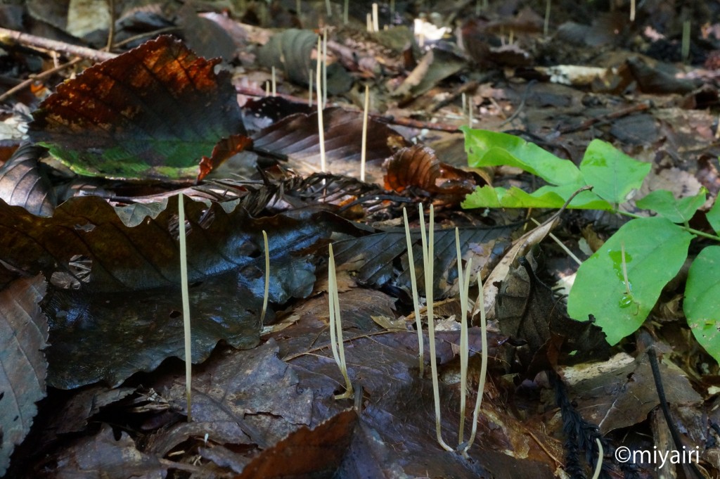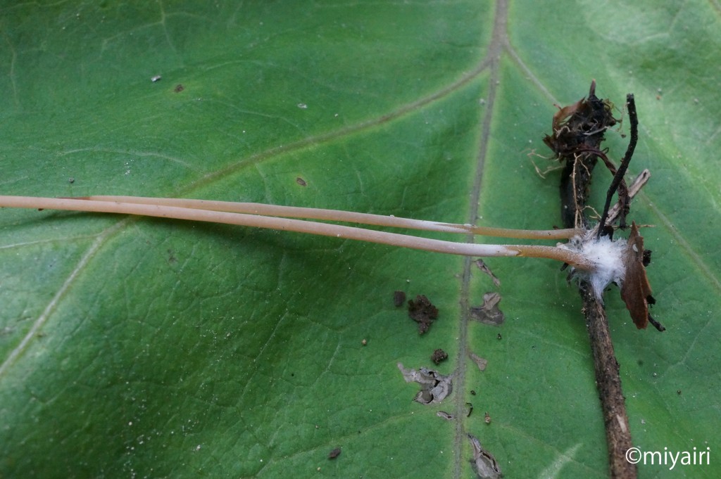 - 子実体は針金のように細長く長さ3~15 cmのこん棒状、鋭頭。はじめ淡赤褐色、のち褐色をおびた灰色。柄は長さ1~5 cmで、中空。上部表面に子実層が形成され、下部はやや細い柄となる。