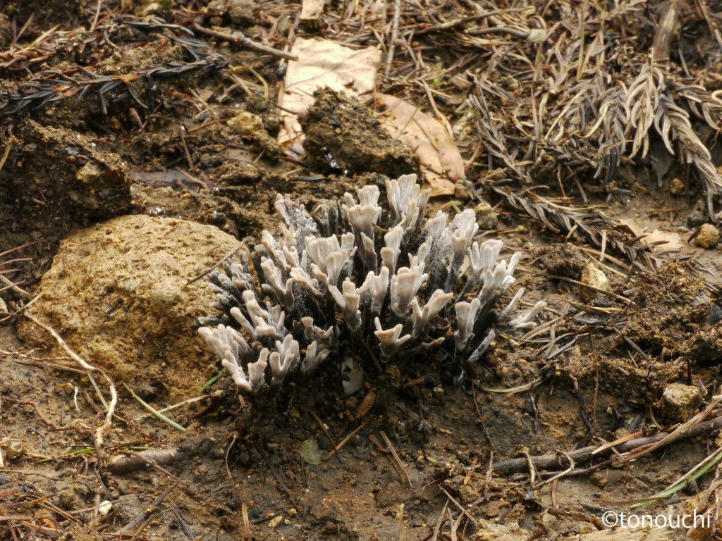 - 上の写真のモミジタケは2013年にアカマツ・杉林内に設けられた遊歩道の造成工事により裸地化した地面から大量発生したものの一部である。
