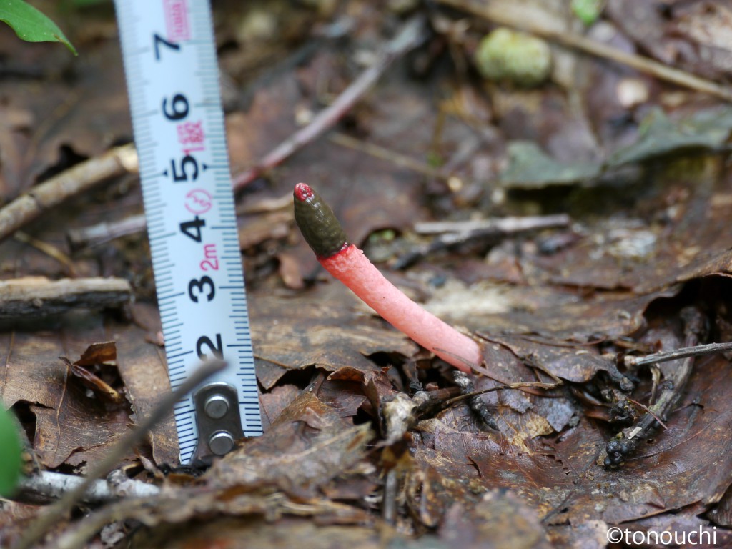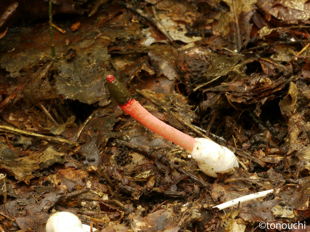 - 子実体は円柱形、高さ7~12㎝、先端1.5~2.5㎝の頭部と下方の柄部(境界は不明瞭)からなる。頭部は濃紅色、下部にむかって次第に淡色、表層部にグレバ(基本体:胞子をつくる組織)を生じ胞子塊は黒褐色粘液状となり悪臭をはなつ。柄部は径6~10㎜、基部に菌蕾(きんらい)のなごりをつける。