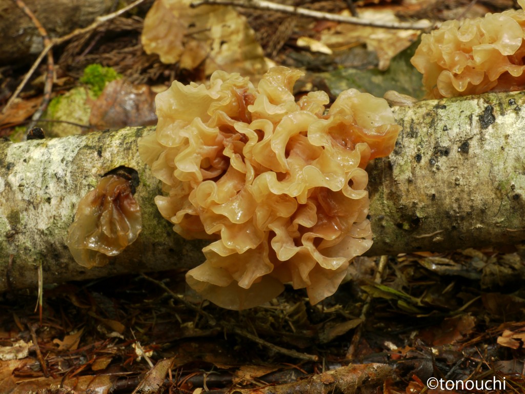 - 子実体は径10 cmほどまで、融合しながら八重咲きの花弁状に成長、ゼラチン質、淡褐色〜赤褐色。