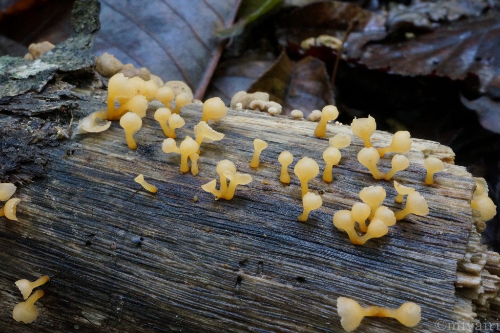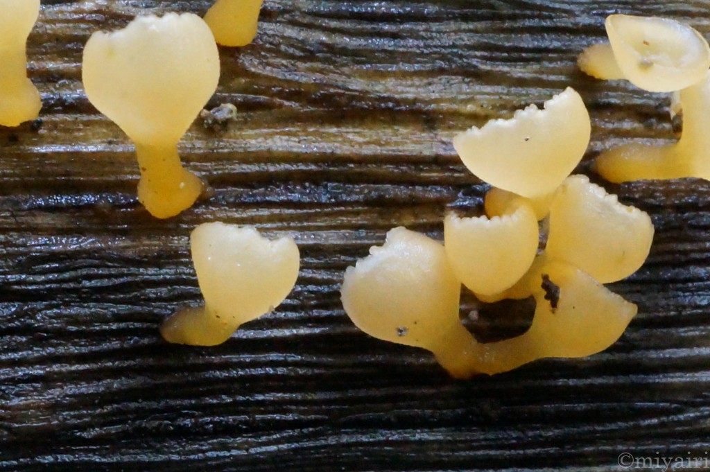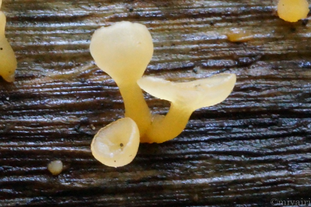 - 子実体はわん状で有柄、透明感があるゼラチン質で橙黄色~黄色、わん外側に縦のしわがあり、縁にギザギザが見られる。全体の高さ5~8 mm、わんの径は3~5 mm、深さ2~3 mm。